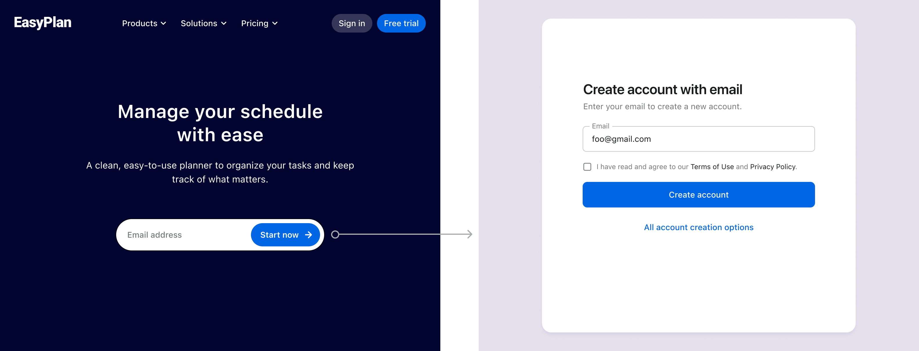 You often see an email sign-up input field prominently displayed on the homepage hero section, encouraging quick user registration. After users enter their email and click the "Start now" button, these parameters allow you to redirect them to the sign-up page with the email field pre-populated, streamlining the registration process.